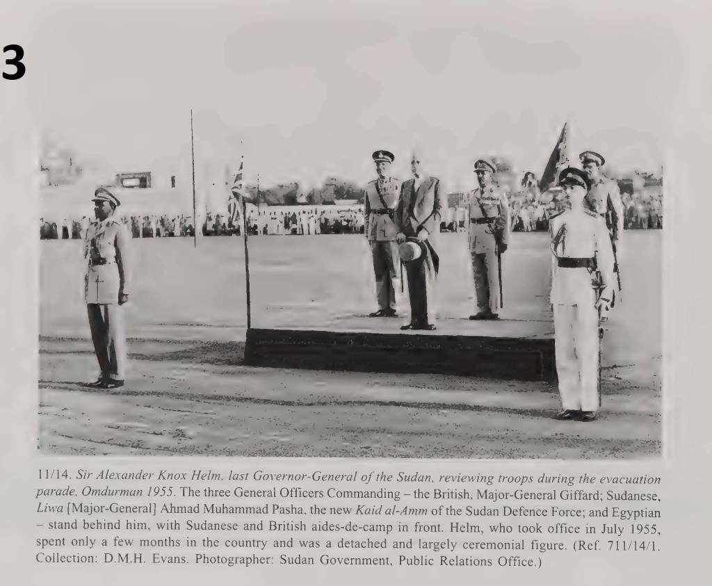 ٣- السير ألكسندر نوكس هيلم، آخر حاكم عام للسودان، يستعرض القوات خلال استعراض الإجلاء، أم درمان ١٩٥٥. يقف خلفه الضباط الثلاثة القائدون: البريطاني، اللواء جيفارد؛ والسوداني، اللواء أحمد محمد باشا، القائد العام الجديد لقوة دفاع السودان؛ والمصري، وفي المقدمة مساعدوه العسكريون السودانيون والبريطانيون. أمضى هيلم، الذي تولى منصبه في يوليو ١٩٥٥، بضعة أشهر فقط في البلاد، وكان شخصية منعزلة ورسمية إلى حد كبير. (المرجع ٧١١/١٤/١. مجموعة: د. م. هـ. إيفانز. المصور: مكتب العلاقات العامة التابع للحكومة السودانية).