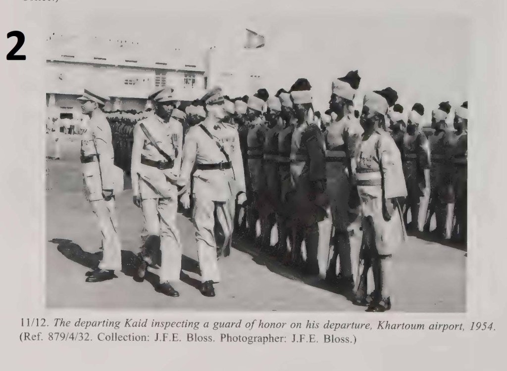 3-Sir Alexander Knox Helm, last Governor-General of the Sudan, reviewing troops during the evacuation parade, Omdurman 1955. The three General Officers Commanding – the British, Major-General Giffard; Sudanese, Liwa [Major-General] Ahmad Muhammad Pasha, the new Kaid al-Amm of the Sudan Defence Force; and Egyptian stand behind him, with Sudanese and British aides-de-camp in front. Helm, who took office in July 1955, spent only a few months in the country and was a detached and largely ceremonial figure. (Ref. 711/14/1. Collection: D.M.H. Evans. Photographer: Sudan Government, Public Relations Office.)