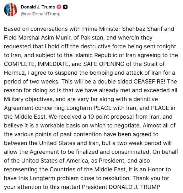 بناءً على محادثات مع رئيس الوزراء الباكستاني شهباز شريف والمشير عاصم منير، والتي طلبا فيها مني وقف إرسال القوة التدميرية الليلة إلى إيران، ورهناً بموافقة الجمهورية الإسلامية الإيرانية على الفتح الكامل والفوري والآمن لمضيق هرمز، أوافق على تعليق قصف إيران وشن هجمات عليها لمدة أسبوعين. سيكون هذا وقفاً لإطلاق النار من الجانبين! والسبب في ذلك هو أننا حققنا بالفعل جميع الأهداف العسكرية، بل وتجاوزناها، وقطعنا شوطاً كبيراً في التوصل إلى اتفاق نهائي بشأن السلام طويل الأمد مع إيران، والسلام في الشرق الأوسط. لقد تلقينا مقترحاً من عشر نقاط من إيران، ونعتقد أنه أساس عملي للتفاوض. تم الاتفاق على جميع نقاط الخلاف السابقة تقريباً بين الولايات المتحدة وإيران، لكن فترة الأسبوعين ستتيح إتمام الاتفاق وتفعيله. نيابةً عن الولايات المتحدة الأمريكية، بصفتي رئيسًا لها، وممثلًا أيضًا لدول الشرق الأوسط، إنه لشرفٌ لي أن أرى هذه المشكلة المزمنة تقترب من الحل. شكرًا لكم على اهتمامكم بهذا الأمر! الرئيس دونالد جيه. ترامب